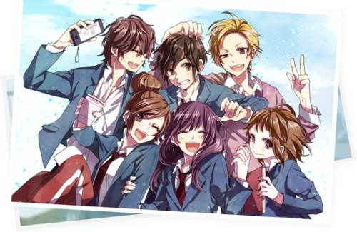 The first section of the story is centered on the six-person group of Yuu, Natsuki, Haruki, Miou, Souta, and Akari. Yuu and Natsuki get together first and remain together for the rest of the series, Souta and Akari can't on the grounds that Akari isn't quite sure what love exactly is and Souta is too nervous and insecure to ask her out, and Haruki and Miou are both in love with each other, but cannot and do not admit it to each other for their entire high school career. Later songs give proper introductions to other potential couples and their relationship woes, who form a secondary group-- Koyuki, a friend of Souta's who changes his appearance in the hopes of winning over Natsuki; Yuu and Natsuki's siblings Hina and Koutarou, who are in a one-sided love triangle because of Hina's affection for Koyuki and Koutarou's crush on Hina; Sena and Midori, a teen model and another student who want to get together but can't approach each other the way they want to; and Ken and Arisa, a playboy and friend of Koutarou and the outspoken girl who didn't initially fall for his charms. The songs would also introduce LIP×LIP, an idol duo who end up the classmates of Hiyori, a student unfamiliar with city life, who are often promoted separately.