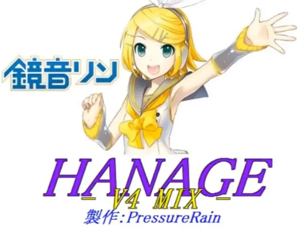 "HANAGE" is a song featuring Kagamine Rin by PressureRain uploaded to NicoNicoDouga July 4, 2009. Their previous channels being suspended has resulted in much of their older works being deleted. It was later in September 2017 that they returned and remade the song using the V4X voicebank. The succeeding versions follow a similar pattern, all being from the VOCALOID4 era.