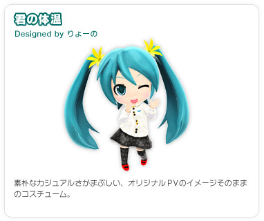 Miku's "Farewell" costume for the song, "Kimi No Taion" designed by Ryouno, featured in the game Project mirai .
