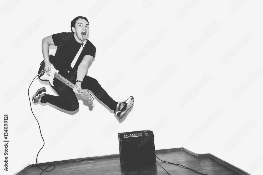An example of the original is titled "Awesome crazy fashion young musician rock guitar player jumps with passion in studio. Stylish rocky emotional man. Black and white toned." Stock Photo 134099121.