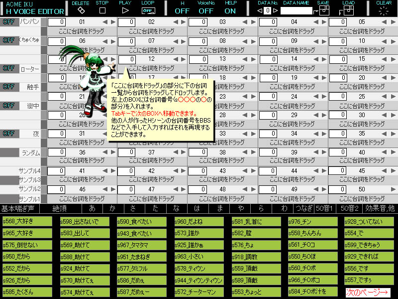 The speaking portion offers a large dictionary of words to which the vocalists can pronounce in a variety of ways and emotions. There are usually 3 different types of voices that can be cross-synthesized, or isolated to portray a single emotion. If they misinterpret kanji, phonemes can be edited. Velocity, Length, Tone, Accent, and Pitch can be edited in this mode.