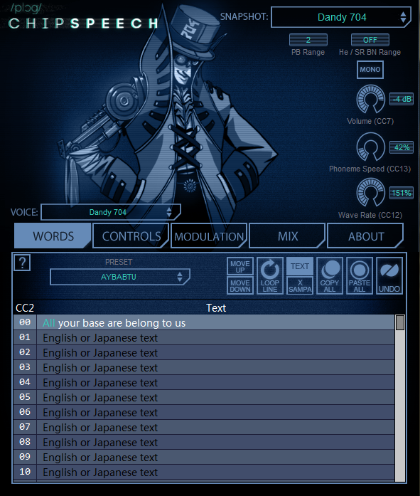 Chipspeech is a synthesizer developed by plogue. A retro styled vocal synthesizer created to reproduce vintage vocal synthesizers released in the 20th century. The software acts as stand alone or plug-in software to various DAWs. It can sing and talk and supports two languages: English and Japanese (though Japanese currently does not have talk capability). There are various means to adjust the vocal in the way the user wants, creating some very unique sounds and results.