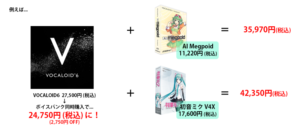 VOCALOID6 Starter Packs labeled as a "VOCALOID6 PLUS VOICEBANK SET" when purchased from the official VOCALOID SHOP include the VOCALOID6 engine as well as copies of the Silhouette Series and the VOCALOID5 vocals Amy, Chris, Kaori, & Ken. Purchasing from the Japanese VOCALOID SHOP allows users the option of purchasing the VOCALOID6 Editor in addition to one to two additional voicebanks at a 10% discount of the normal purchase price, excluding the upgrade discount, during the campaign period.[39] On the English VOCALOID SHOP, users have the option to select one of the current available PLUS VOICEBANK SET options, currently including: AI Megpoid, Po-uta, Fuiro, and galaco BLACK & WHITE.[40]